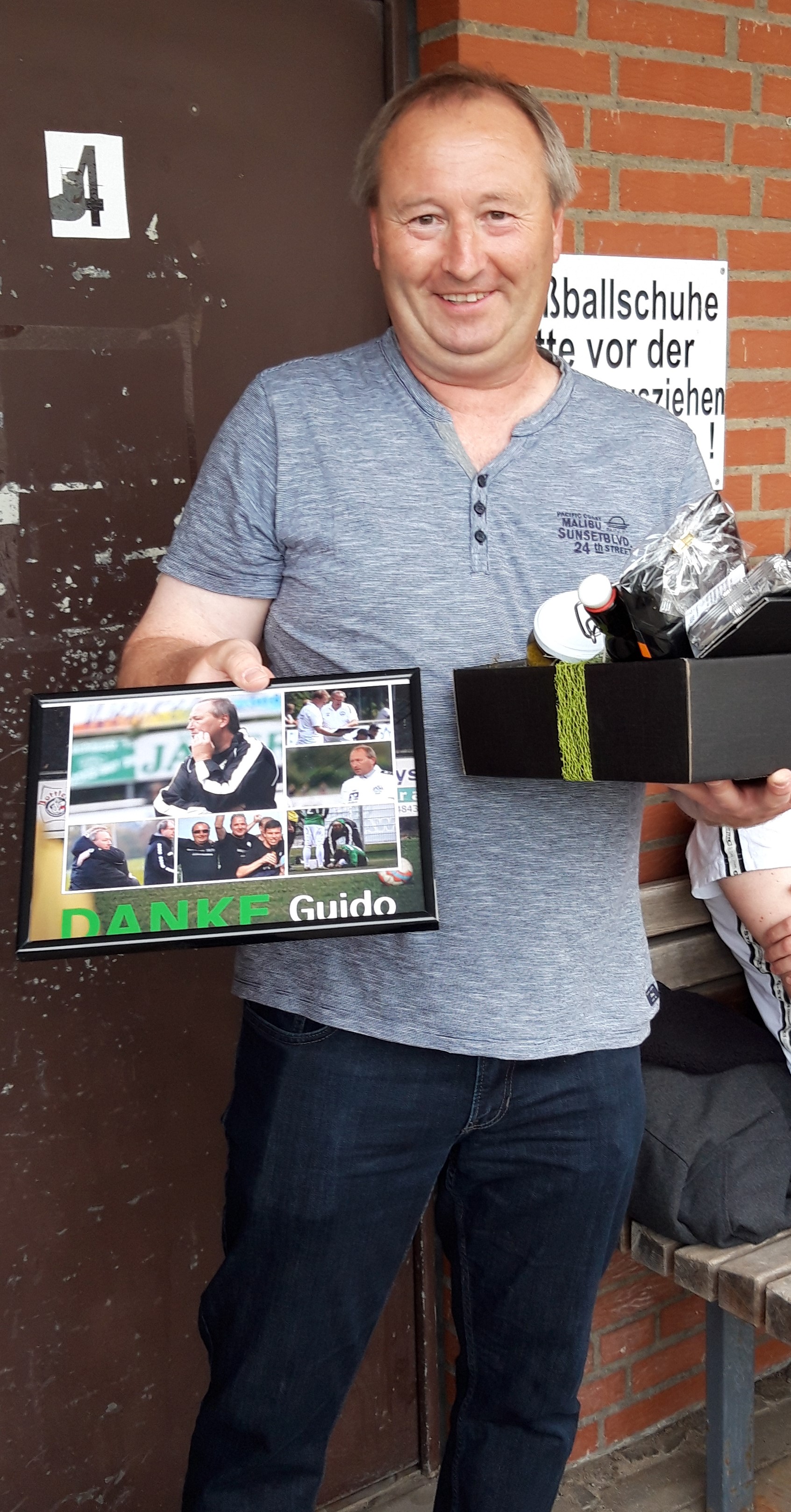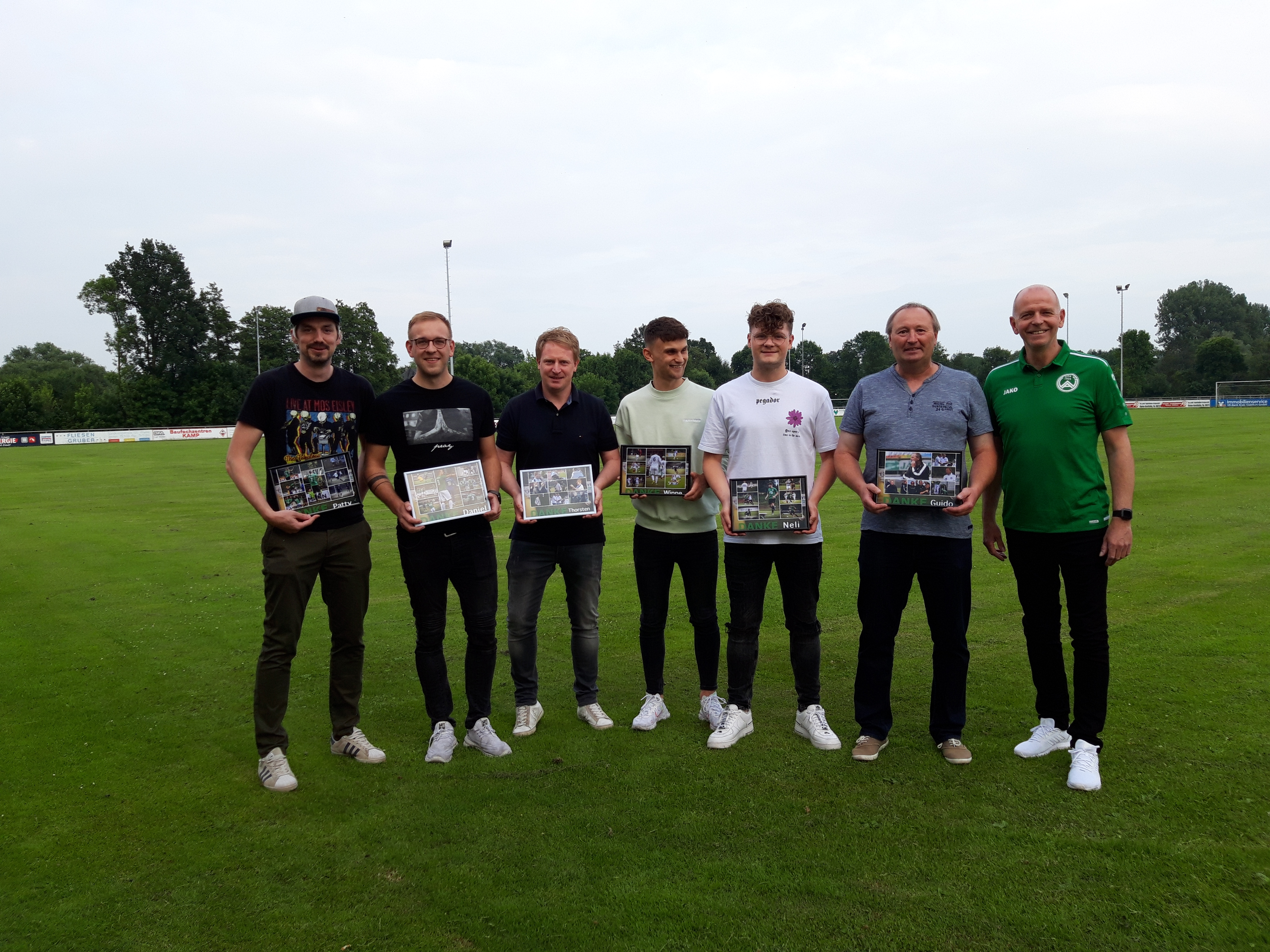 Da wir die scheidenden Trainer und Spieler jedoch nicht einfach so gehen lassen wollten, fand die Verabschiedung Ende Juni in einem kleinen Rahmen im Stadion "Zur Emsaue" statt. Ralf Schneider bedankte sich stellvertretend für den Vorstand bei den einzelnen Spielern und überreichte jedem einzelnen zur Erinnerung eine "Collage" mit Bildern aus ihrer aktiven Zeit bei Grün-Weiß Amisia Rheine.